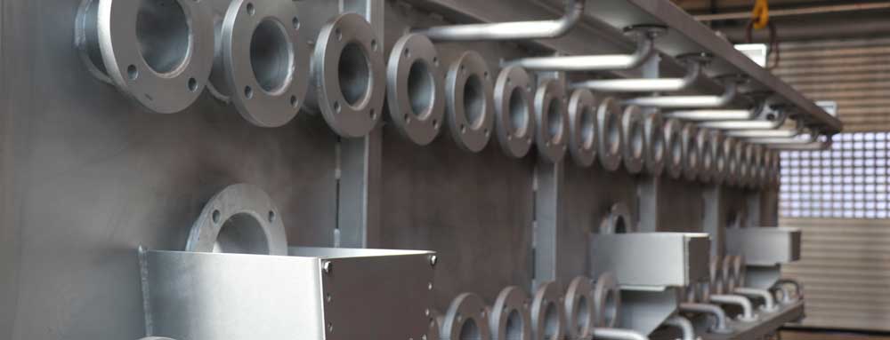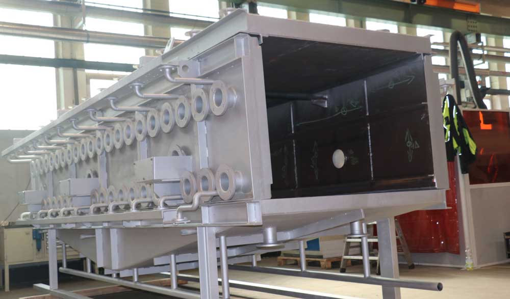 Für einen Großkunden in der Stahlindustrie wurde ein speziell konstruierter Kühlkasten zur kontrollierten Abkühlung von Elektrostahlbrammen gefertigt. Das Bauteil bringt ein Gesamtgewicht von 6 Tonnen auf die Waage und verfügt über die Abmessungen 5500 mm Länge, 2500 mm Breite und 2300 mm Höhe.