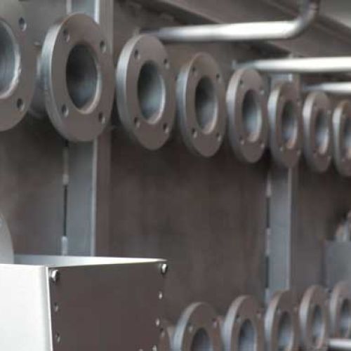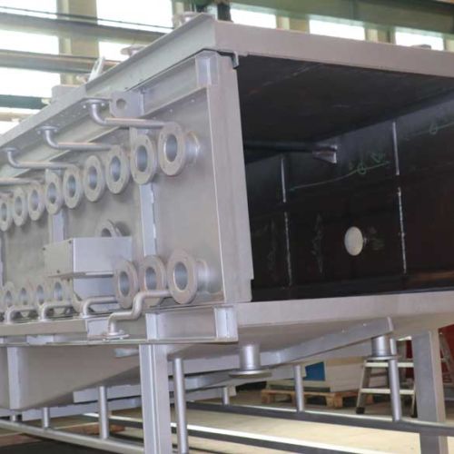 Für einen Großkunden in der Stahlindustrie wurde ein speziell konstruierter Kühlkasten zur kontrollierten Abkühlung von Elektrostahlbrammen gefertigt. Das Bauteil bringt ein Gesamtgewicht von 6 Tonnen auf die Waage und verfügt über die Abmessungen 5500 mm Länge, 2500 mm Breite und 2300 mm Höhe.